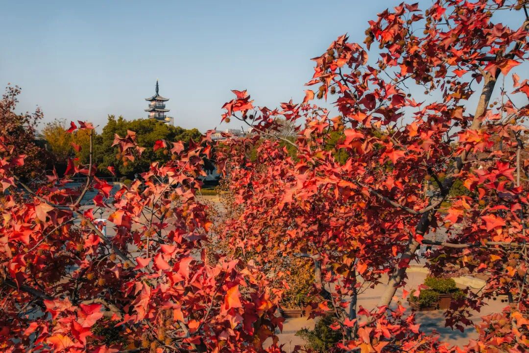 不远处的博乐广场上,枫香树染上了斑驳的红晕,为这幅秋景图增添了浓重的色彩。
