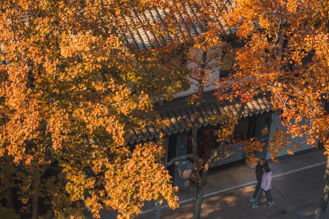 秋日暖阳下,弹硌路上落叶与光影交织在一起。遛弯的居民和驻足拍照的游客,共同构成了老街闲适的生活画面。