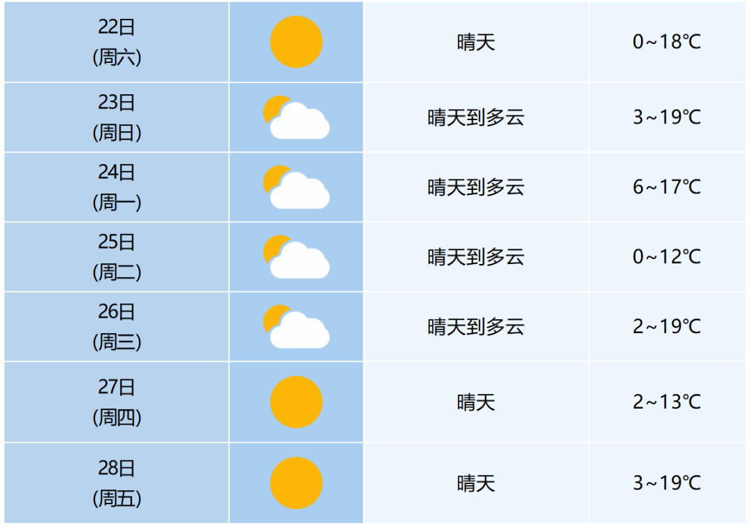 22日(周六):江北晴天转多云,江南晴天到多云。