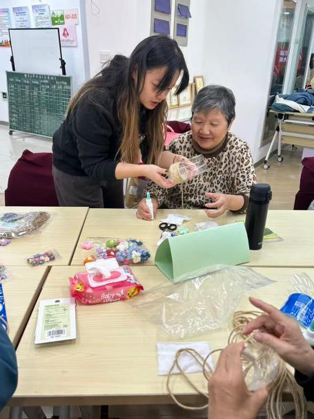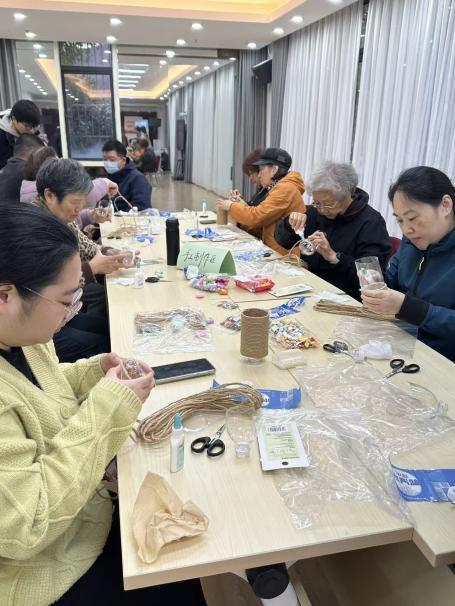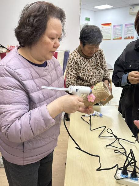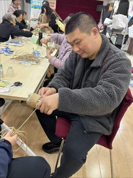 一位参与活动的阿婆皱着眉头说:“哎呀,这根绳子老是打滑!”志愿者耐心地演示:“您试试这样,每绕三圈就在背面点一点胶水固定。”不一会儿,阿婆就掌握了技巧,露出得意的笑容。