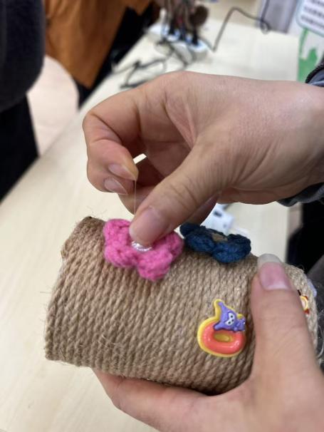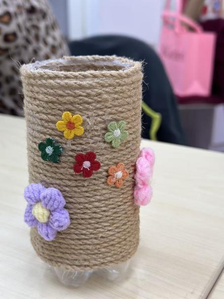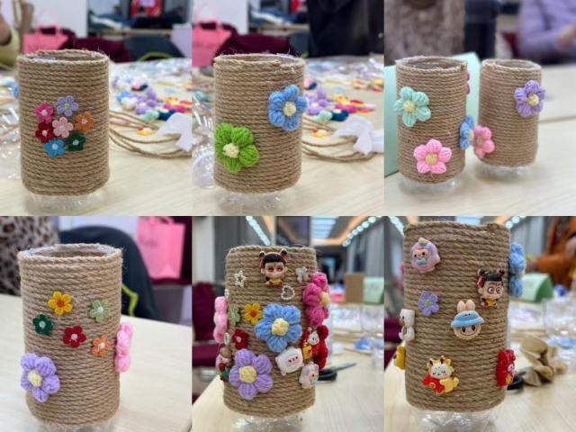 张阿姨专注地装饰着自己的作品,她小心地将“爱心”和“ Labubu ”贴在缠好麻绳的瓶身上,又点缀了几颗小珍珠。她举起完成的花瓶,对着光端详,眼里满是成就感:“我这个瓶子本来都要扔了,现在变成这么漂亮的花瓶,我要拿回家种绿萝!”