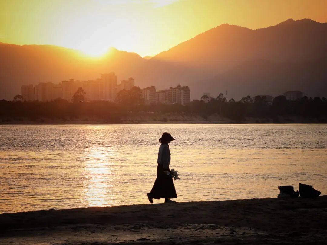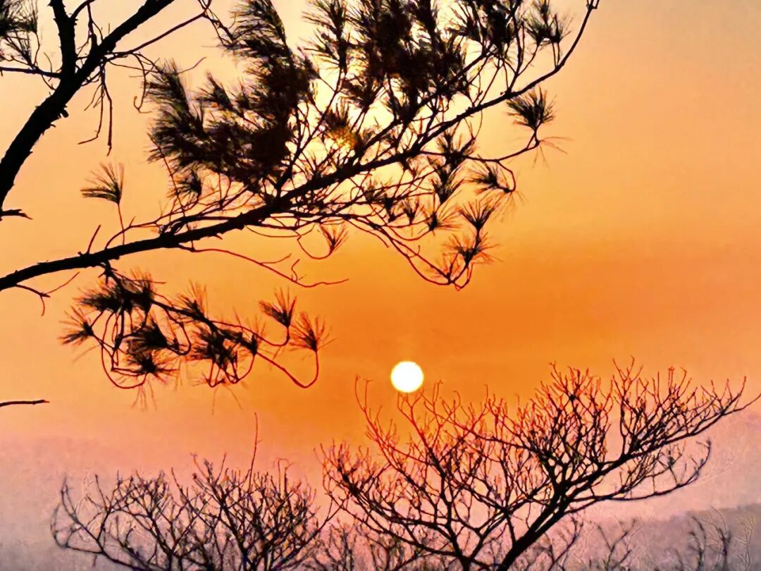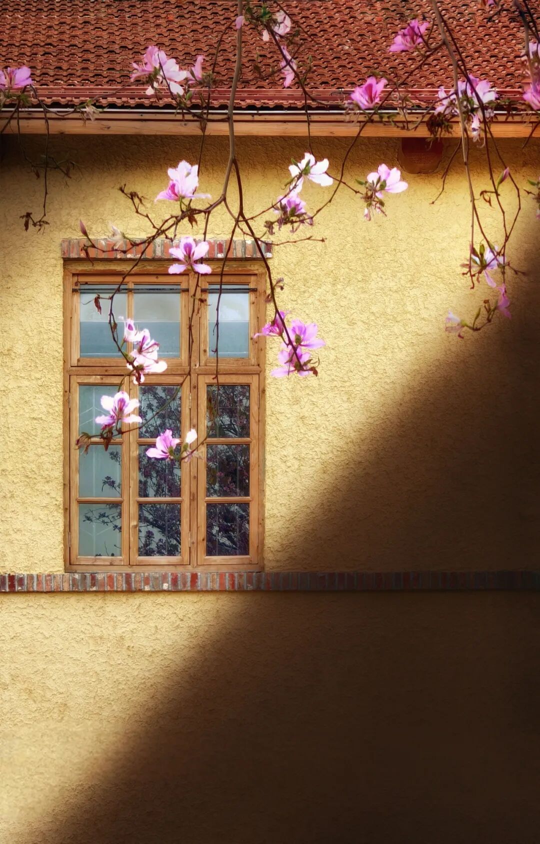 在破晓前最寒冷的空气中,屋上青瓦覆着一层薄霜,静静矗立。一片清冷寂静中,篱笆旁的黄花含着露珠,成了唯一的亮色。