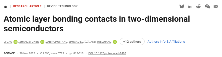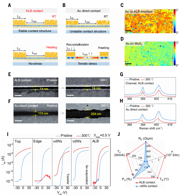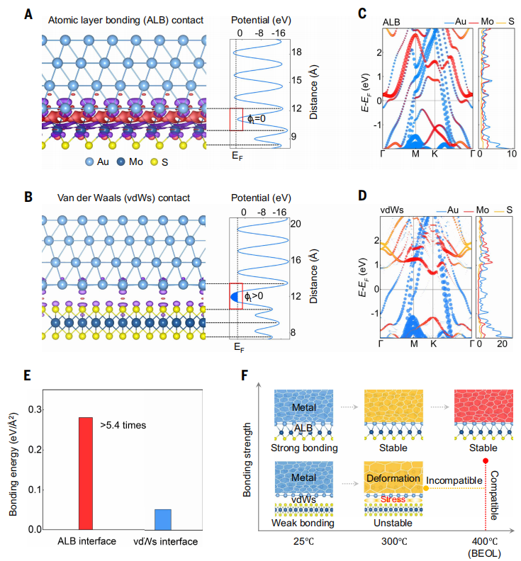 近期,北京科技大学张跃院士、张铮教授和张先坤教授联合首创“原子层键合(ALB)”工艺。该工艺利用超软氩等离子体选择性剥除单层MoS2表面硫原子,暴露的Mo原子层因失配应力自发收缩6%,与Au(111)晶格失配从8%骤降至<0.3%,形成金属 - 金属共格界面。此界面键合能提升至0.28eVÅ - 2,是vdW的5.4倍,载流子隧穿势垒接近0eV,首次同时实现70Ω·μm接触电阻、400°C热稳定性及1.1mA·μm - 1饱和电流,全面满足2028年IRDS高性能逻辑需求,且在WS2、MoSe2等多层二维半导体中验证了通用性,为二维集成电路从“实验室到晶圆厂”扫除了最后障碍。