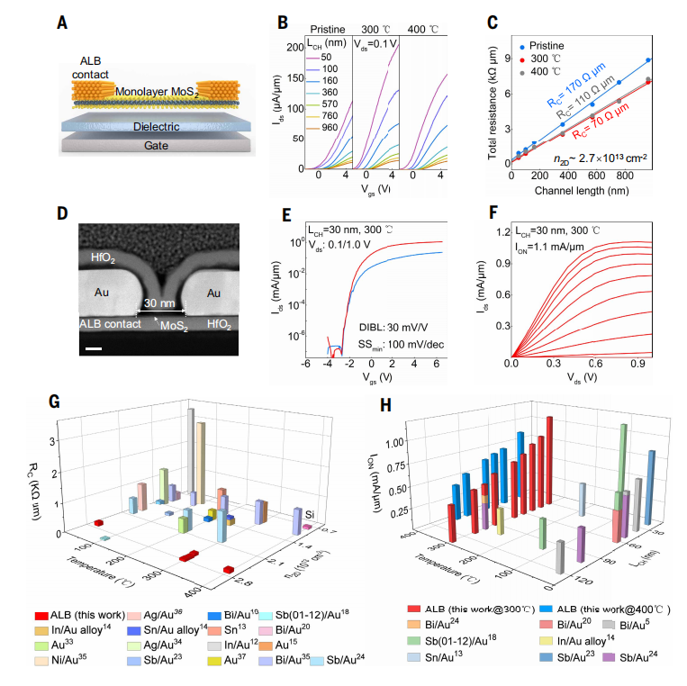 图2、MoS2与金电极之间ALB合金接触的实现。
