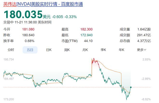 虽然业绩超出预期,但公司股价却下挫。美东时间11月20日,英伟达股价大跌3.15%。21日盘中,其股价也出现巨震,一度跌超4%,随后跌幅收窄,截至发稿跌0.33%。
