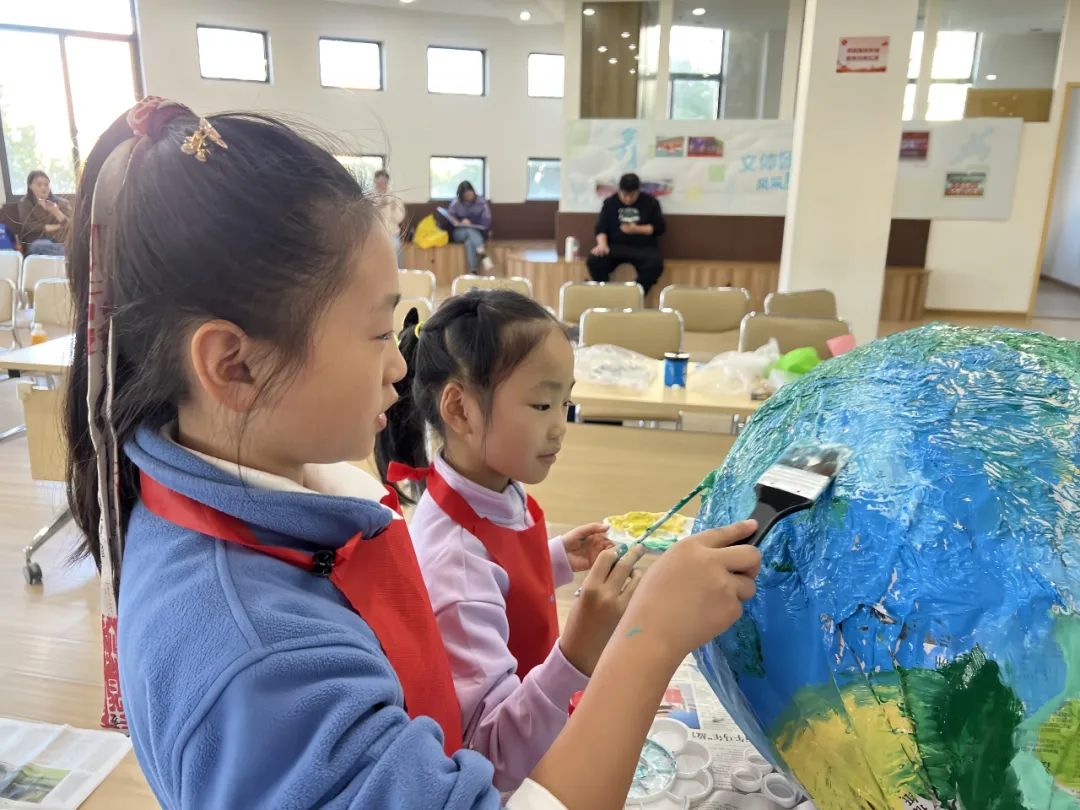 活动现场充满了创作与讨论的热烈氛围,没有严肃的说教,孩子们都积极主动地参与其中,成为寻找答案的“未来合伙人”。在“妙笔绘地球”环节,来自水丰路小学和上理附小的学生们化身为“地球修补师”。他们先在球体模型上精心描绘出蔚蓝海洋与翠绿大陆,随后把收集来的废弃瓶盖、塑料片等生活垃圾拼贴在这个美丽的星球上。