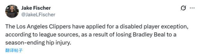 北京时间11月22日,据名记杰克 - 费舍尔报道,由于布拉德利 - 比尔髋部受伤赛季报销,洛杉矶快船队已申请伤病特例。