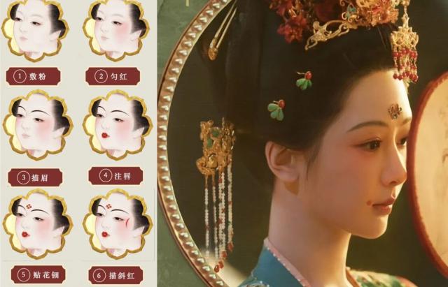 在唐代化妆步骤中:敷妆粉➡️匀红 / 抹胭脂➡️画眉➡️注唇➡️贴花钿、点面靥➡️描斜红(彩妆部分顺序可调,版本不一),斜红是红妆里最重要的一环,和我们现在打腮红有点像,只是用了具象的形状展现。