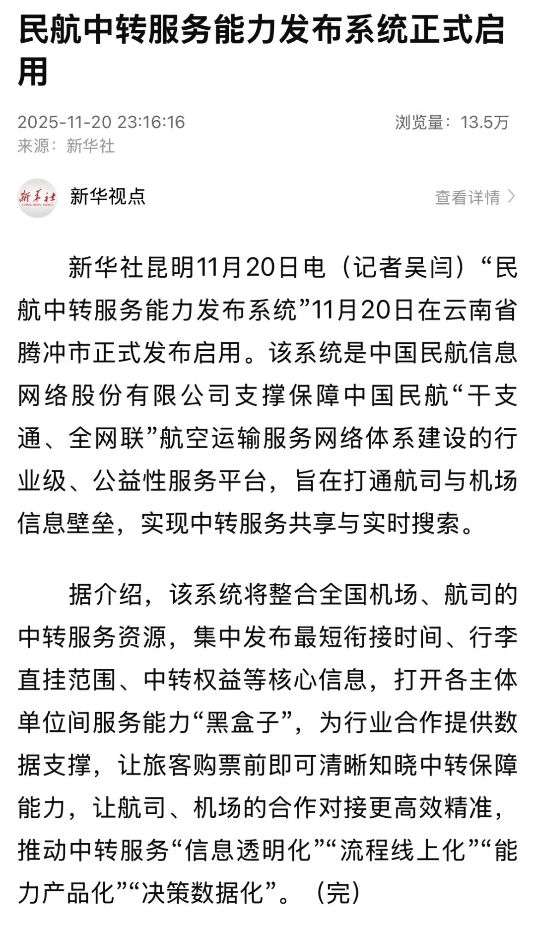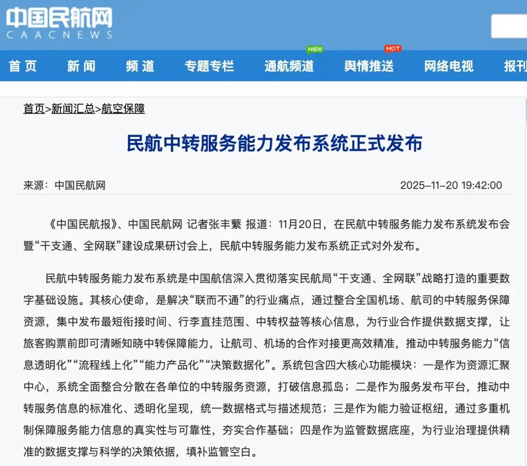 报道显示:该系统是中国航信落实民航局‘干支通、全网联’战略打造的重要数字基础设施。近年来,在民航局支持下,中国航信打造了民航中转旅客服务平台,截至目前,已服务2.2亿中转旅客。今年,在民航局运输司指导下,中国航信与民航局清算中心推出中转旅客逾重托运行李‘一次支付、实时清分、全程保障’新模式,助力行李直挂全流程贯通,实现‘人享其行’,共建‘全国民航一张网’。