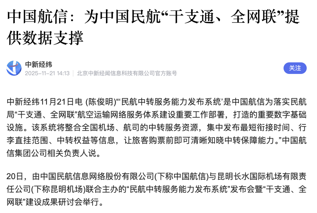《中国航信:为中国民航‘干支通、全网联’提供数据支撑》