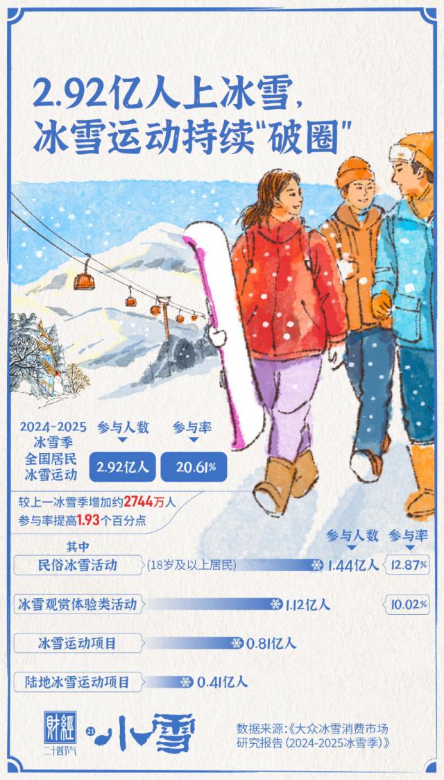 小雪时节,朔风催雪,冰雪经济市场活力满满。第十五届全国运动会的举办点燃了全民运动热情,体育活力持续释放,冰雪运动从专业赛场走向大众生活,成为越来越多人冬季消费的选择。《大众冰雪消费市场研究报告(2024 — 2025冰雪季)》显示,2024 — 2025年冰雪季期间,全国居民参加冰雪运动人数达2.92亿人,参与率为20.61%,冰雪经济的热度持续攀升。
