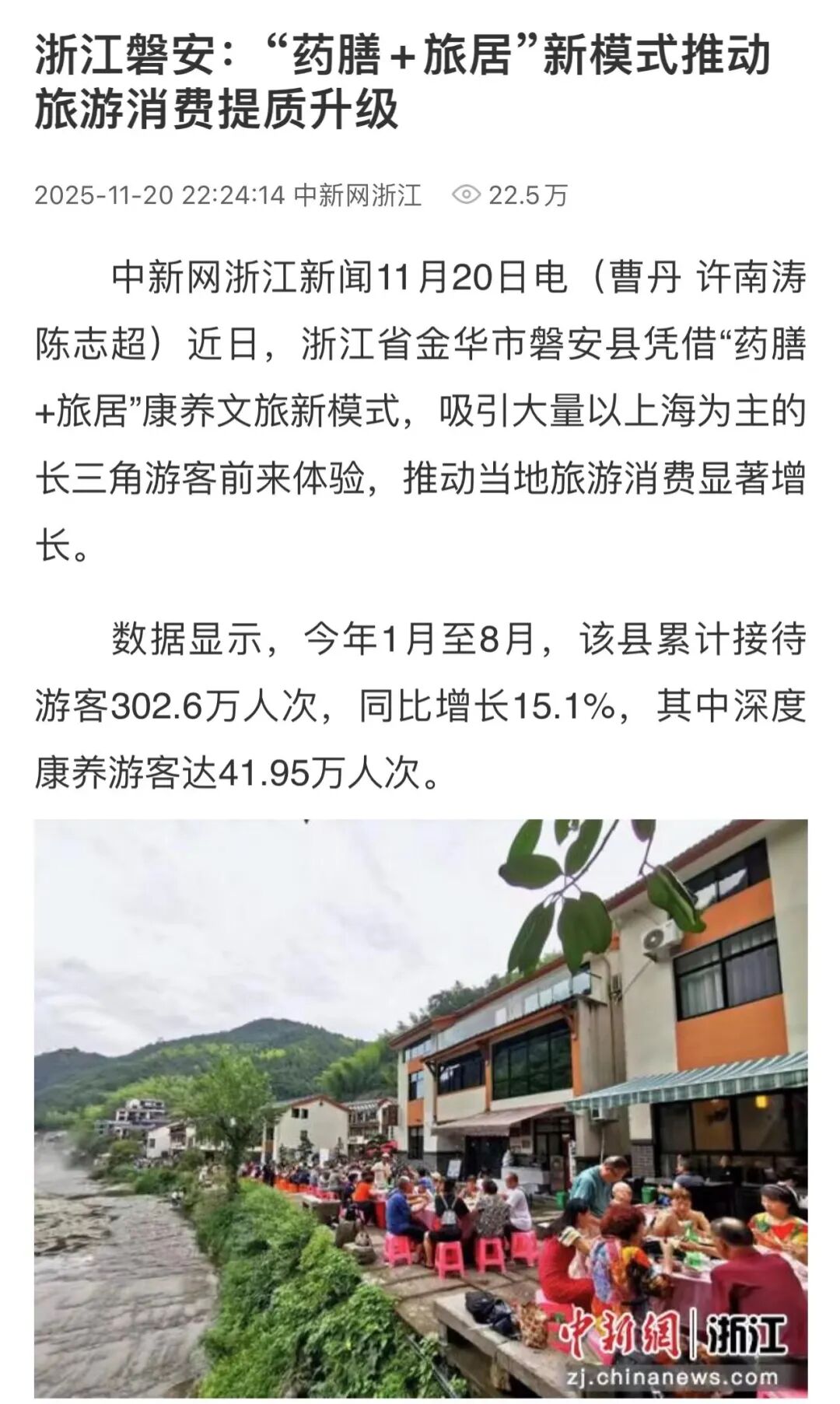 11月21日,中新网客户端报道《浙江磐安:“药膳+旅居”新模式推动旅游消费提质升级》,关注到金华磐安凭借“药膳+旅居”康养文旅新模式,吸引大量长三角游客前来体验,推动当地旅游消费显著增长。