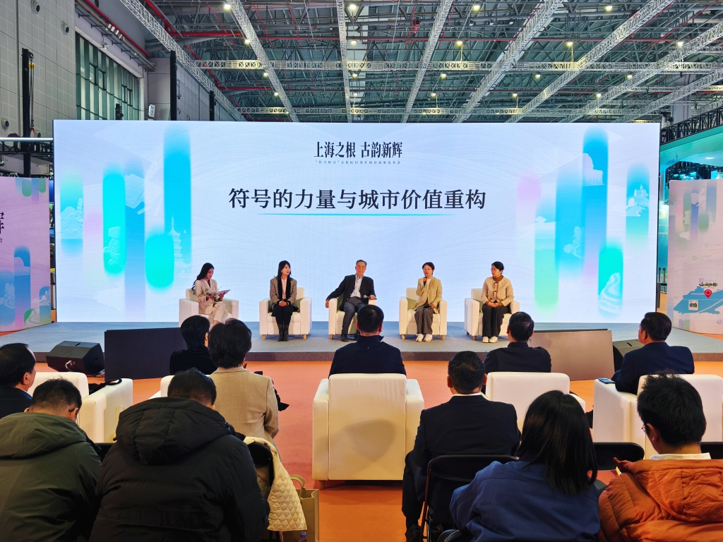 现场,新华社原副社长周锡生,松江区委宣传部副部长、区文明办主任沈茜,上海视觉艺术学院全媒体传播创新研究中心主任孙智华与上海松江文旅公司总经理白洁围绕‘符号的力量与城市价值重构’这一主题展开对话交流,共同探讨如何通过符号创新,将‘上海之根’的深厚文化底蕴转化为推动松江文化产业发展和城市能级提升的强大动力。