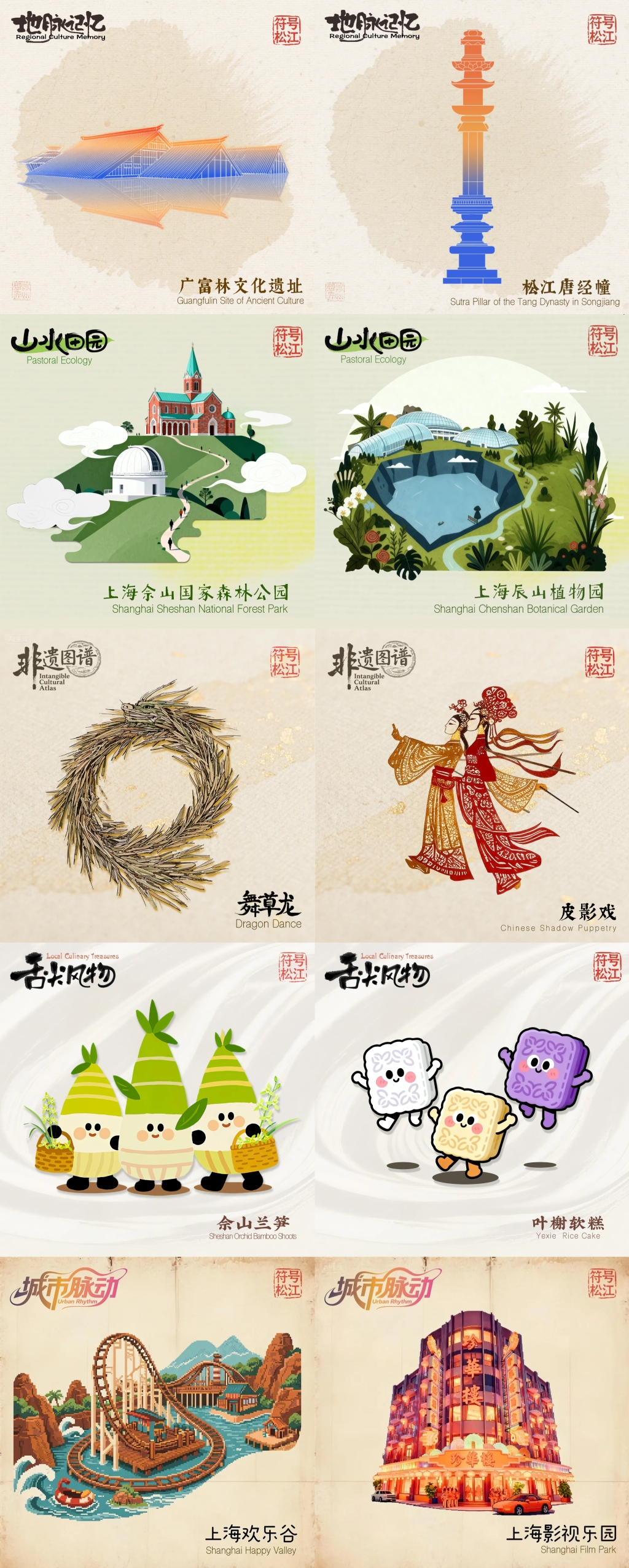这100个具有高度辨识度与文化代表性的符号元素后续将作为统一的视觉语言,为松江文旅商体农展的各个方面赋能,进一步阐释‘上海之根’的文化内涵。