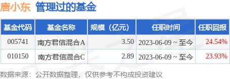 唐小东先生为中国国籍,拥有法国国立统计与经济管理学校经济统计硕士学位,具备基金从业资格。他曾先后在中国银行总行、莫尼塔投资咨询有限公司、川财证券有限责任公司、浙江乾瞻投资管理有限公司、弘则弥道投资咨询有限公司工作,担任过职员、研究员、策略研究总监等职。2020年3月加入南方基金,现任宏观策略部联席总经理;自2023年6月9日起,担任南方君信混合基金经理。