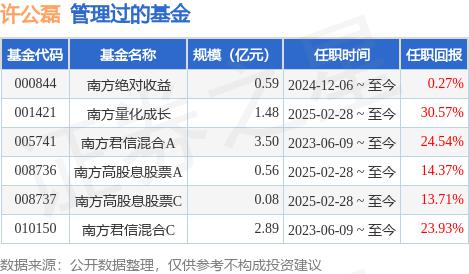 许公磊先生同样是中国国籍,拥有法国国立统计与经济管理学校金融市场专业和法国巴黎第九大学应用数学专业双硕士学位,具备基金从业资格。他曾在上海拍拍贷金融信息服务有限公司、弘则弥道投资咨询有限公司工作,担任过风险专员、高级分析师。2020年3月加入南方基金,任宏观策略部研究员;自2023年6月9日起,担任南方君信混合基金经理;自2024年12月6日起,担任南方绝对收益策略定开混合发起基金经理;自2025年2月28日起,担任南方高股息主题股票型证券投资基金和南方量化成长股票型证券投资基金的基金经理。
