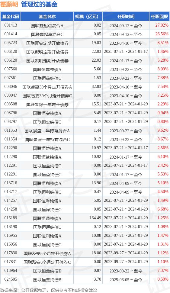 霍顺朝先生为中国国籍,毕业于清华大学经济学专业,拥有研究生学历和硕士学位,具备基金从业资格。他曾在多家金融机构任职,2015年3月至2021年4月,在国融证券股份有限公司历任研究员、投资主办、投资顾问授权代表。2021年4月至2023年2月,担任建信理财有限责任公司投资经理。2023年3月加入中融基金管理有限公司,现任固收投资部基金经理。他在国联旗下有多只基金的管理经验,2023年4月10日起任中融睿嘉39个月定期开放债券型证券投资基金、国联聚安3个月定期开放债券型发起式证券投资基金的基金经理;2023年9月22日起任国联恒鑫纯债债券型证券投资基金、国联景盛一年持有期混合型证券投资基金基金经理;2024年1月17日担任国联恒益纯债债券型证券投资基金、国联聚明3个月定期开放债券型发起式证券投资基金基金经理;2024年4月9日起任国联恒利纯债债券型证券投资基金的基金经理;2024年9月12日起任国联鑫起点灵活配置混合型证券投资基金的基金经理。