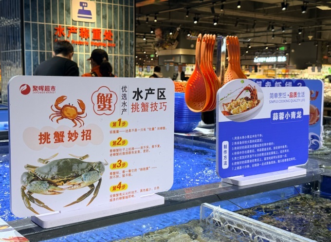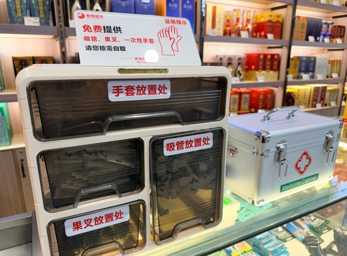 顾客服务细节用心。水产区现捞沥水、除皮;服务台有餐具和医药箱;连卷袋旁有湿手器和手套。还有商品介绍等提示卡片,提供便利。