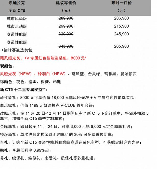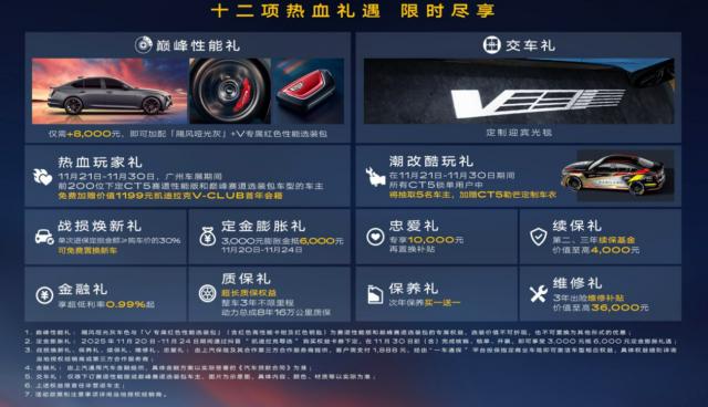 11 月 21 日,2025 广州车展凯迪拉克展台变身热血赛道派对,明星车型全新 CT5 以满改姿态激情登场。此次,全新 CT5 推出了 V 专属性能车色「飓风哑光灰」以及 V 专属红色性能选装包,其中包含专属 Brembo V 标涂装红色高性能卡钳、赛道专属红色钥匙等性能装备。而且,用户还能享受 12 重丰厚豪礼,像 8000 元解锁价值 18000 元热血装备的巅峰性能礼、限时 3000 元抵 6000 元的定金膨胀礼、限时赠送价值 1199 元 V - CLUB 会籍的热血玩家礼等。特别值得一提的是,全新 CT5 还推出了超厉害的“战损焕新礼”,车辆单次定损超三成就能免费置换等价新车,为年轻人的第一台后驱车提供有力保障。源于对赛道的纯粹热爱,凯迪拉克全新 CT5 出厂即满改,以本色出街,热血上场。