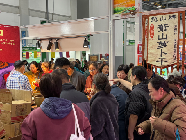 从早上8:30开始,朱老板就忙个不停,他笑着说:‘喉咙都哑了,一口饭还没吃嘞。’朱老板的摊位主要卖党山牌萧山萝卜干,他介绍,萧山萝卜干以‘色香甜脆鲜’五绝闻名,是浙江省非物质文化遗产,一直很受杭州市民喜爱。‘今天卖得最火的还是萝卜干,不少都是老客,知道我们要来农博会,就叫上亲朋好友一起来支持了。’朱老板说,为了这次省农博会,他们一共准备了将近两吨的酱菜,上午已经卖掉了1000多斤,均价在15 - 18元。