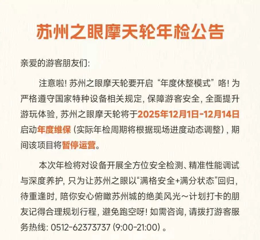 苏州之眼摩天轮将于近期开展年检工作,届时将暂停运营。