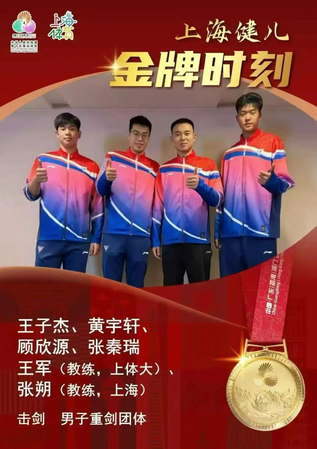 在男子重剑团体决赛中,由闵行运动员黄宇轩、张秦瑞和队友们组成的上海队与山东队展开了一场激烈对决,最终上海队以45比43的微弱优势险胜对手,成功夺金。