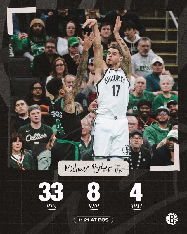 自从小迈克尔 - 波特离开掘金后,鲜少出现在新闻里。但实际上,他最近状态出色。在过去 8 场比赛中,小波特代表篮网出战,场均能砍下 27.8 分、7.5 个篮板和 3.3 次助攻,投篮命中率达 50.3%,三分命中率为 40.6%。本赛季至今,他一共打了 14 场比赛,其中有 5 场得分超过 30 分!
