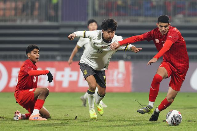 比赛开场不到半小时,U16国足就奠定了胜局。开场仅5分钟,U16国足右路战术角球开入禁区,邝兆镭挑传门前,帅惟浩头球破门。第24分钟,万项右路拿球内切过人直塞,帅惟浩禁区右路抽射再进一球。1分钟后,帅惟浩前场禁区内抢断后推射击中立柱,万项补射时被门将扑倒,主裁判判罚点球,万项稳稳罚进,比分变为3比0,比赛胜负已无悬念。全场比赛伤停补时阶段,孔玺诺禁区内抽射击中横梁,张伯霖补射得手,最终比分定格在4比0。