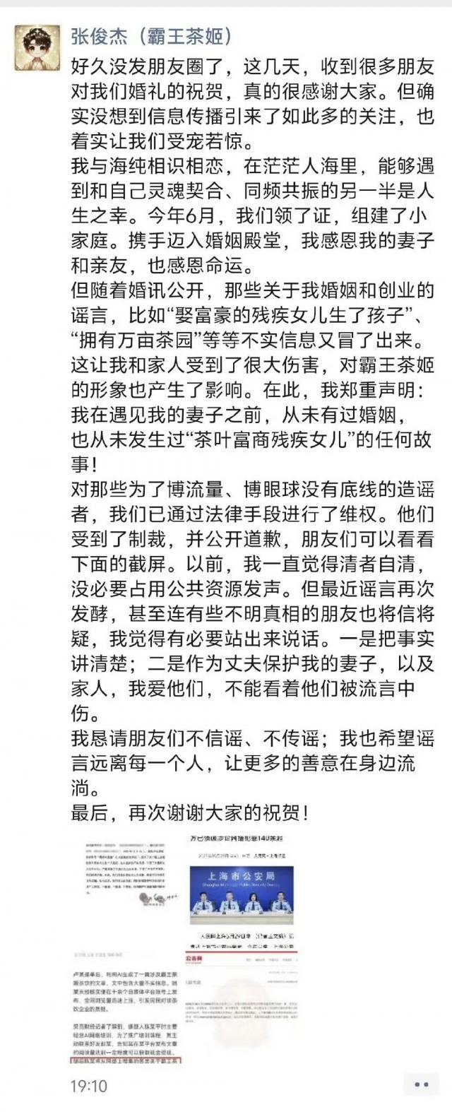 针对连日来由婚讯引发的沸沸扬扬传言,霸王茶姬创始人张俊杰11月21日晚发朋友圈辟谣:从未娶过“茶叶富商残疾女儿”,对为了博流量毫无底线的造谣者已通过法律手段维权。