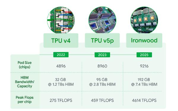 今年4月份,谷歌公布了自研的第七代TPU平台,代号Ironwood。该平台配备192GB HBM内存,带宽达7.4TB/s,单芯片性能达到了4614TFLOPS,是第五代TPU性能的10倍,同时每瓦性能约是第五代的6倍。
