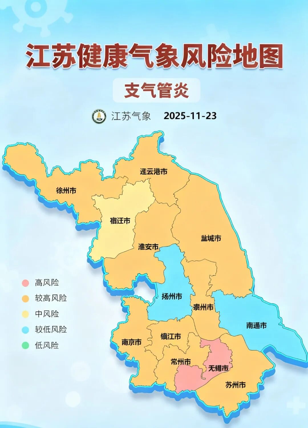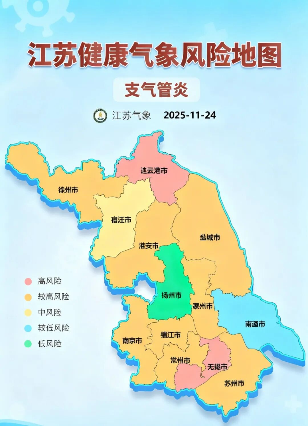 日前,江苏省气象服务中心发布江苏健康气象风险地图。根据未来气象条件,预计今明两天,江苏支气管炎疾病发病风险较高,其中苏州处于较高风险地区。建议大家外出可佩戴口罩,适度锻炼,多饮水。