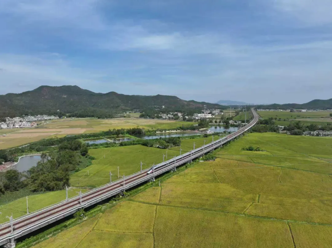 在白沙镇西村,和谐号如银箭般穿过稻田,车身映着金浪,把丰收的诗意带向远方。陈舒文/摄