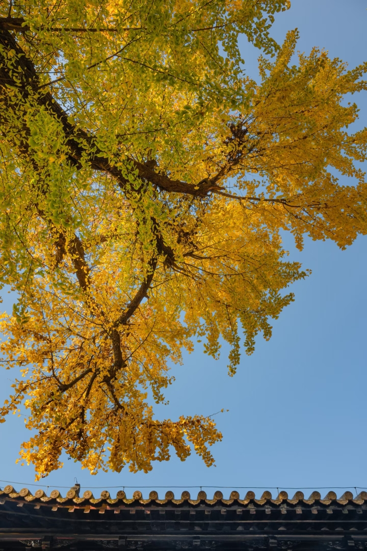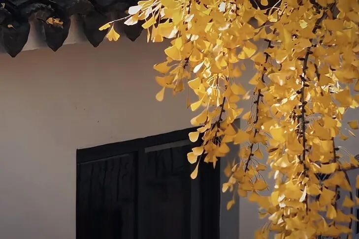 闪冲村内的这株银杏树大约种植于北宋宣和年间,树龄近千年,树冠幅达600多平方米,树干需好几个成年人才能合抱,现属于省级重点保护古树。金黄叶片如金甲护身,与周边古朴的建筑相互映衬,为清冷的天气增添了一份充满历史感的“诗情画意”。