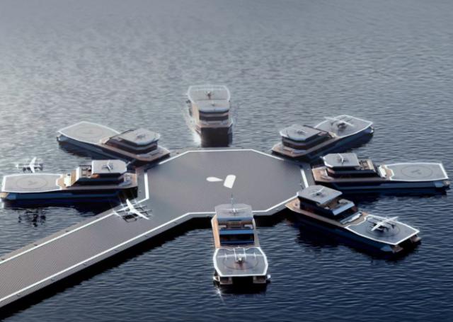 该机场专为eVTOL航空器设计,采用纯电驱动,其宽大的甲板作为起降平台,上面铺设了光伏板,船舱则作为候机厅与机务室。它不仅能满足eVTOL起降及充电需求,还能与eVTOL共享数据,实现智能协同。