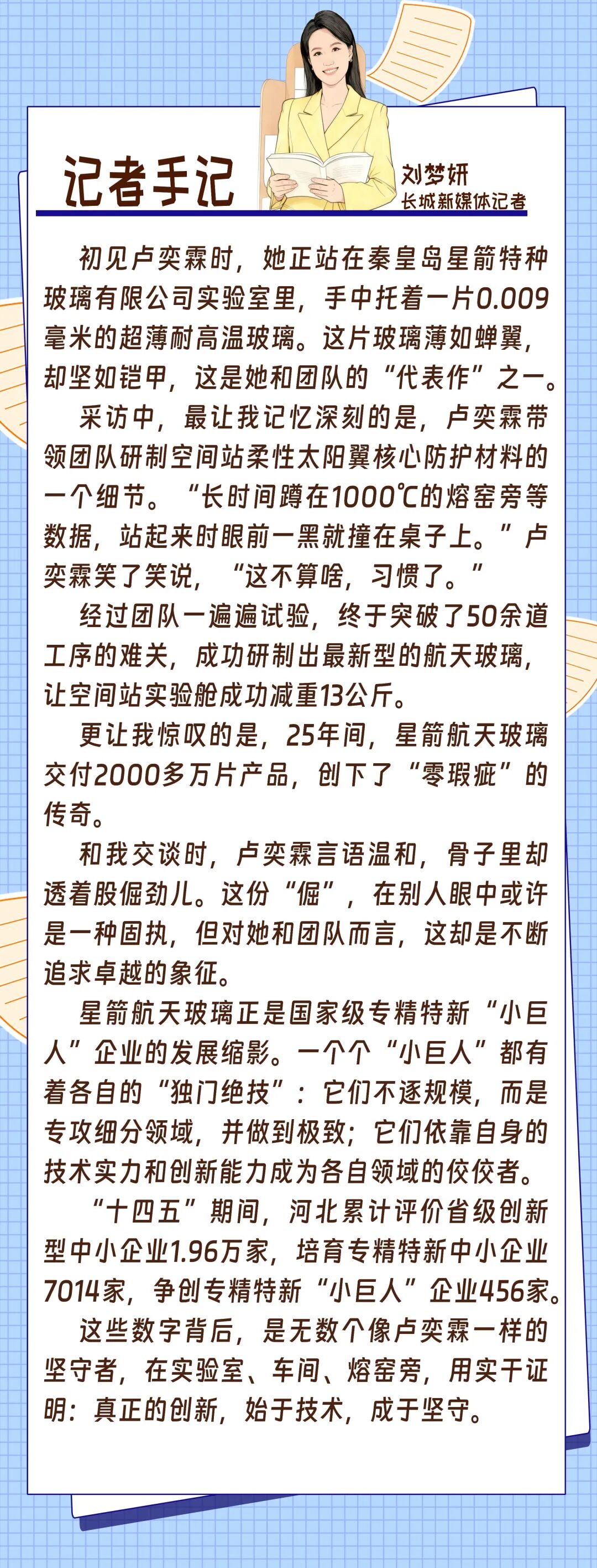 看似普通的小玻璃实则拥有“大本领”。在秦皇岛星箭特种玻璃有限公司的生产车间里,每一片表面寻常的玻璃,背后都肩负着非凡的航天使命。该公司自主研发的超薄柔性抗辐照玻璃盖片,助力中国空间站“梦天”“问天”实验舱成功减重13公斤……这些成果,不断刷新着中国航天玻璃的性能极限。