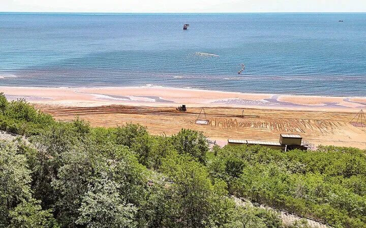 在抚宁区沿海,工人们正驾驶机械清理沙滩。