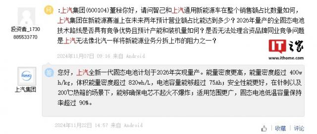 上汽集团在去年11月回复投资者提问时表示,全新一代固态电池计划于2026年实现量产,其能量密度超过400wh/kg、体积能量密度超过820wh/L、电池容量能够超过75Ah。