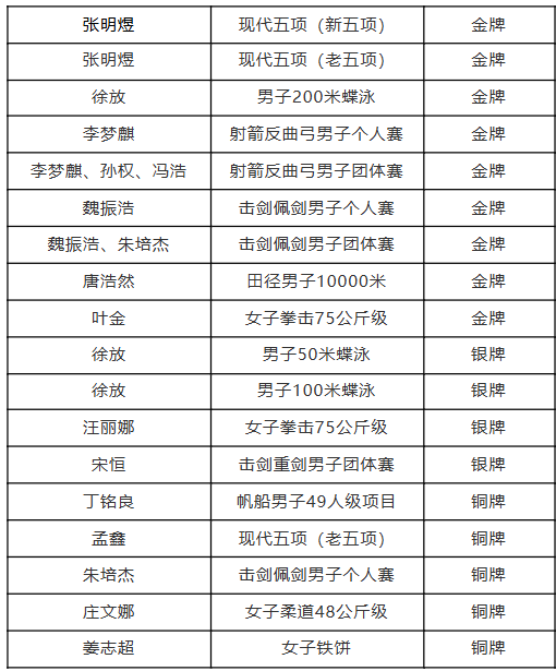 另外,2019级运动训练专业校友宋恒代表山东队获得击剑男子重剑团体赛银牌,2017级运动训练专业校友丁铭良代表山东队获得帆船男子49人级铜牌,2023级运动训练专业本科生庄文娜获得女子柔道48公斤级铜牌,2023级运动训练专业本科生姜志超在女子铁饼项目中获得铜牌。