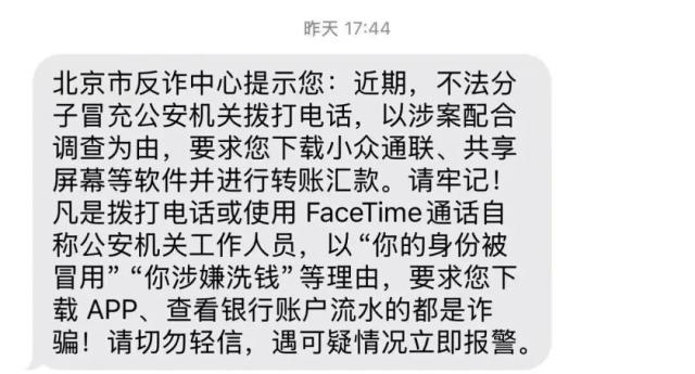 近日,许多北京市民都收到了一条来自北京市反诈中心的短信提醒。短信中写道:"近期,不法分子冒充公安机关拨打电话,以涉案配合调查为由,要求您下载小众通联、共享屏幕等软件并进行转账汇款。
