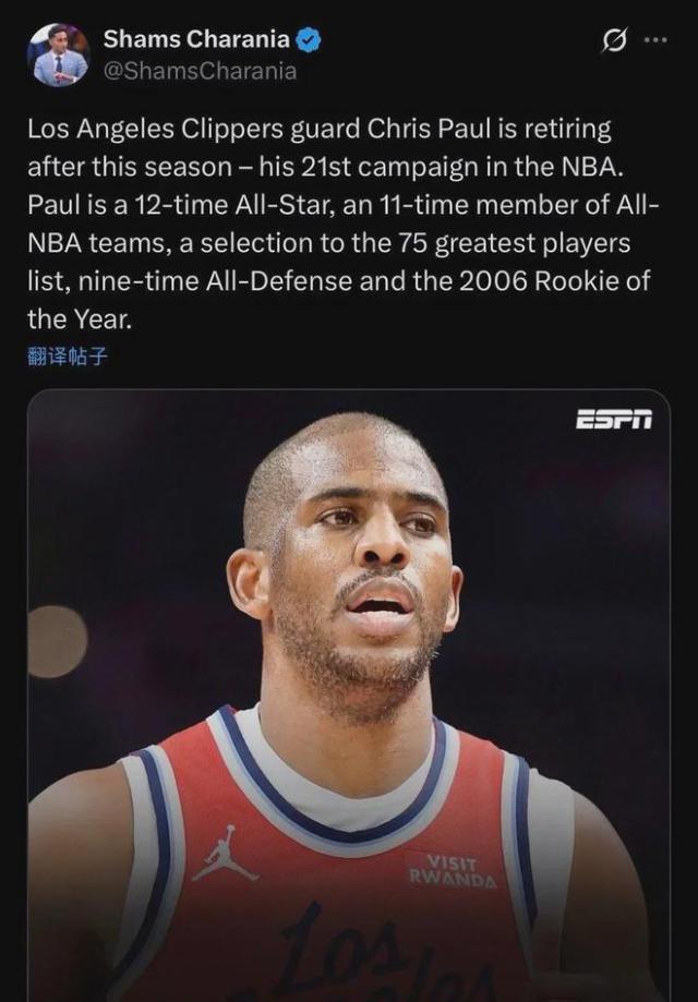 爆料王Shams表示,保罗将在本赛季结束后宣布退役。从票务网站信息可知,保罗常规赛生涯谢幕战,也就是明年4月13日快船主场对阵勇士的比赛,最低票价已涨至129美元。