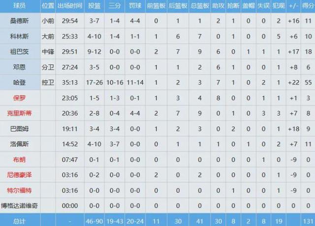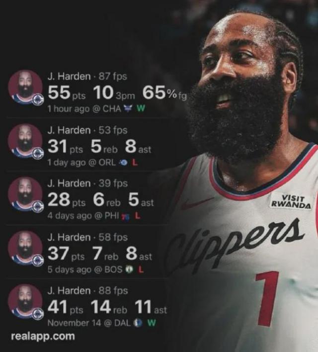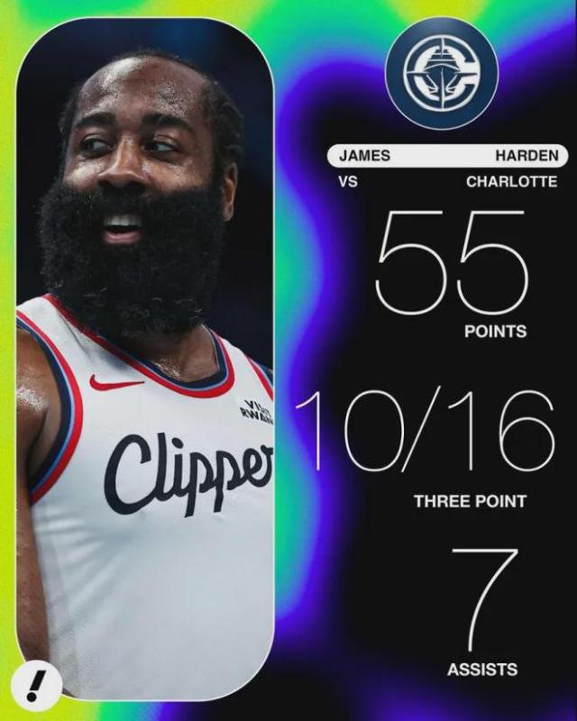 天呐,已经36岁的哈登,投篮26中17,其中三分球16中10,罚球14中11,狂砍55分,还有3个篮板和7次助攻,带领快船以131 - 116击败黄蜂。