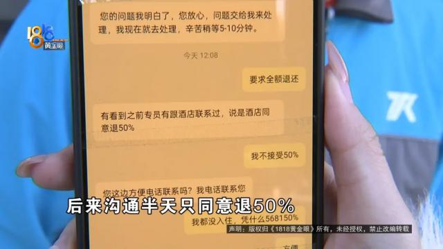 之后,张先生说商家一直联系不上,他只好把情况反映给了美团平台。联系平台也很费劲,平台人工客服要等60分钟之后才有,打电话还老是机器人回复。后来平台联系商家沟通,商家称超过了入住时间,要扣费和收取罚金。记者询问退房情况,张先生表示订单上没有可点的退房选项,他联系美团人工客服,刚开始协商只退30%,要扣70%,后来沟通半天,平台只同意退50%。