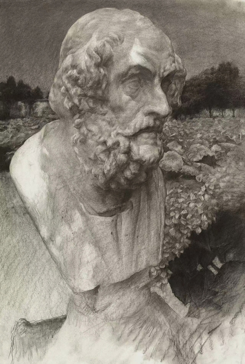 展览中,最年轻的杨政的《窗影中的荷马》打动人心,它捕捉到现代性的情绪:隔阂、怀旧与静观的孤独。他偏爱画破旧、有岁月痕迹的石膏像,他说:“我觉得比新的石膏更有人情味。”