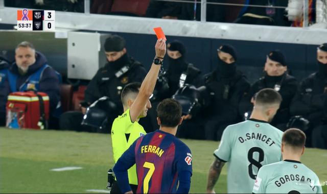 下半场,巴塞罗那抢开局意图明显,保持前场高压逼抢。埃里克加西亚抢断、直塞,费尔明拿球劲射破门,3:0!再次丢球后,毕尔巴鄂竞技球员心态失衡,桑切特暴力铲倒费尔明,险些引发冲突,裁判经视频回放后直接出示红牌将其罚下!大比分落后且少一人,毕尔巴鄂竞技基本无力追分。