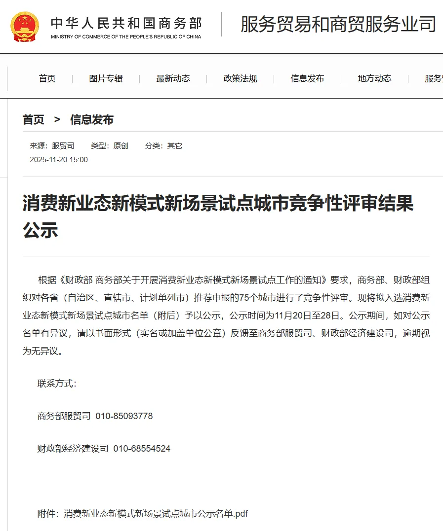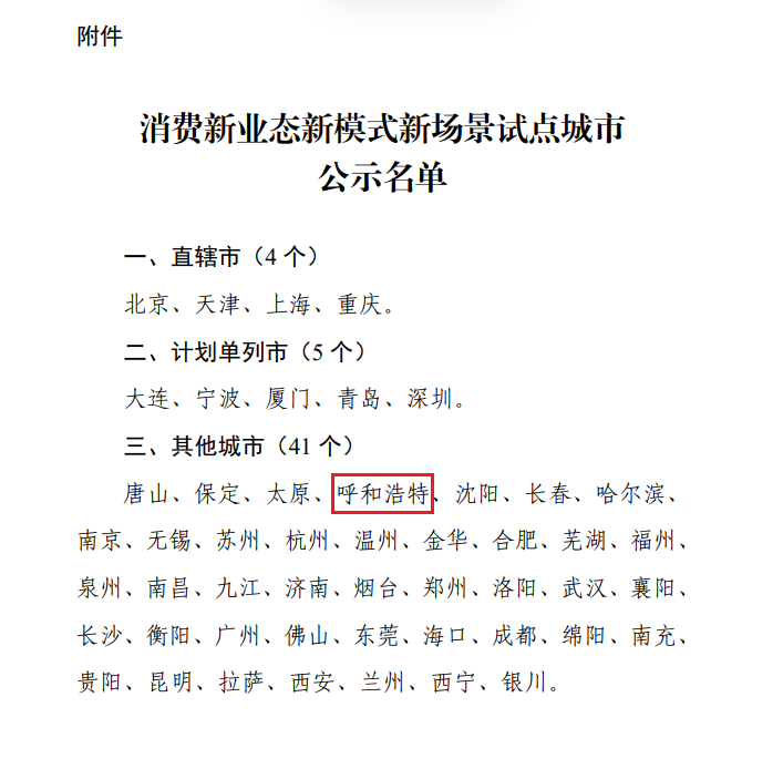 11月20日,商务部网站公布了消费新业态新模式新场景试点城市竞争性评审结果公示,共有50个城市入选,呼和浩特位列其中。