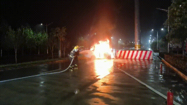 事后询问当事人得知,车辆在行驶过程中因爆胎导致方向失控,撞上路边水泥护栏从而引发了火灾。
