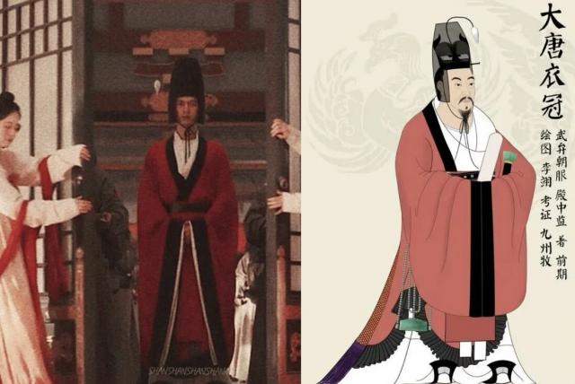 单独佩戴平巾帻时,多着褶衣,褶衣外还可搭配裲裆,下穿袴,在骑马或运动时为了方便活动,可在膝盖下扎束裤管,裲裆不仅是一种内衣,也是一种前后两片四方形相连的铠甲。徐正溪剧中也按照这种风格搭配,只是头上的平巾帻做得略显大了一圈。
