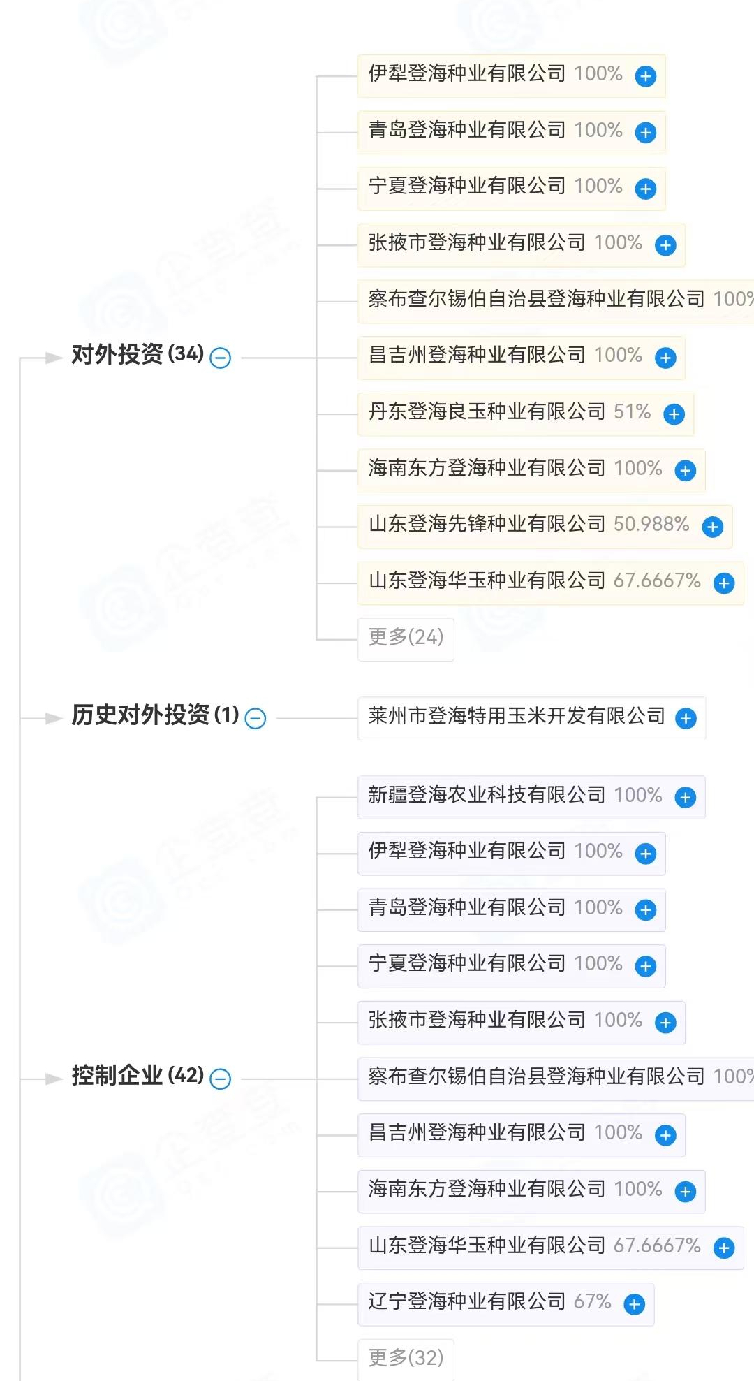 企查查信息显示,登海种业对外投资已达34家,除上述两家以及海南东方登海种业外,还包括青岛登海种业有限公司、宁夏登海种业有限公司、山东登海先锋种业有限公司、山东登海华玉种业有限公司等,控制企业有42家。