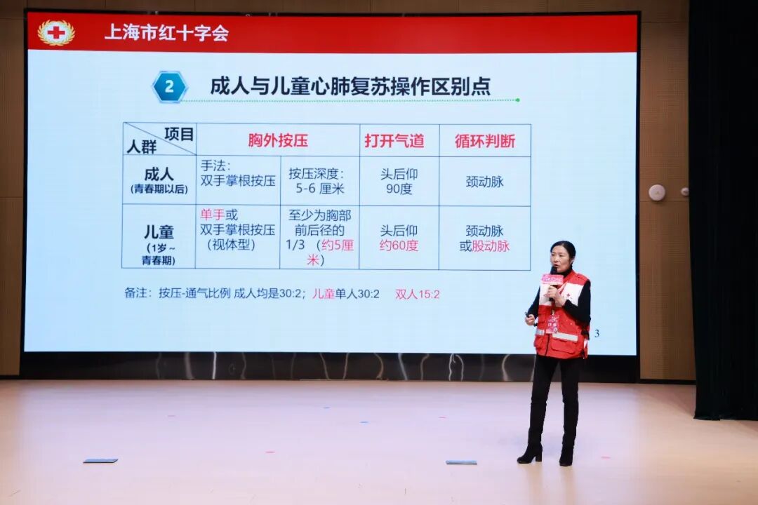 为保障赛事的专业性与公正性,主办方特别邀请上海市红十字应急救护核心师资团队担任评委。赛后,上海市红十字会市级师资培训师、核心师资及督导员梁英老师进行点评。她既肯定了选手们操作规范、心理素质稳定的优点,也针对性指出按压深度控制、三角巾打结松紧度及人文关怀提供等需要完善的细节。随后,梁英老师还带来“应急有方救护有别”儿童急救知识微讲座,结合儿童生理特点与真实案例,用通俗语言阐释儿童与成人应急救护的关键区别,重点讲解儿童心肺复苏、气道梗阻急救要领及婴儿心肺复苏按压力度控制等实用技能。她边讲解边演示,现场教职工或跟随模仿、或录制视频,力求扎实掌握急救技巧。