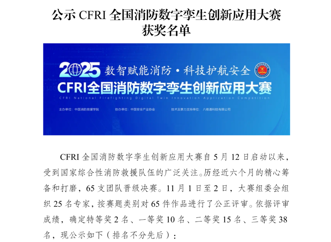 近日,在中国消防救援学院主办的CFRI全国消防数字孪生创新应用大赛上,大同市消防救援支队“灵珠焰卫”团队凭借“大同某购物广场防消联勤”项目,从全国近300支参赛队伍中脱颖而出,在“典型场所防消联勤工作方案优化”赛题中荣获三等奖。